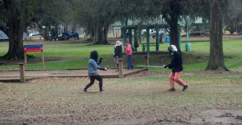 Vero wartet tapfer drei Stunden nebenan im WoMo auf dem Parkstreifen und fotografiert uns durch die „Planche“ der Hobbyfechter hindurch, die sich ebenfalls sonntags nachmittags zum Training treffen.