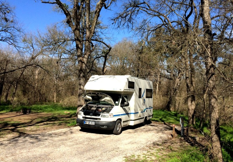 Es ist kaum zu glauben, dass wir in der Nähe der Hauptstadt von Texas sein sollen. Hier wird echt geschrotet… Texas hat die für uns bisher schnellsten Hwys aller Staaten mit einer Höchstgeschwindigkeit von teilweise 130 Stundenkilometern FÜR ALLE! Das bringt uns mit unseren 80-90 km/h echt weit auf die äußerst rechte Spur.