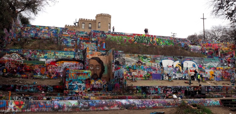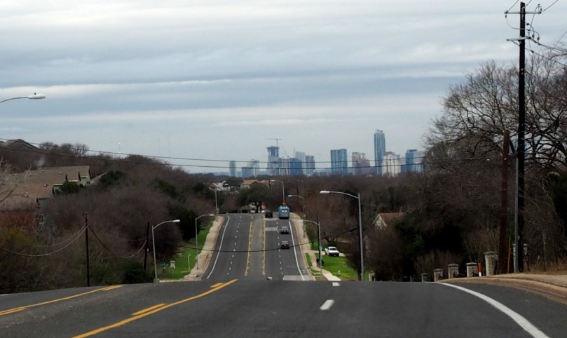 Es gibt nur einen klitzekleinen „zack vorbei“ Moment auf diesem Hügel, von dem aus wir Downtown Austin zu Gesicht bekommen… Ok, es scheint auch ein Bus von hier aus in die City zu fahren.
