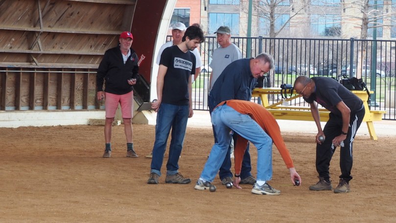 Wir treffen Jim Schwobel mit Boule-Kugeln, hölzernen Zielkugeln, hier Jacks genannt und Abwurfringen zum Kennenlernen von Petanque! Kinder und Eltern, MarktbesucherInnen üben sich nach seinen Anweisungen. So wird langsam aber sicher ein texanischer Volkssport geboren!
