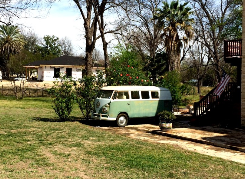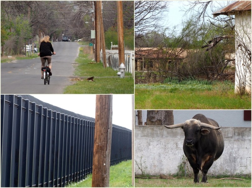 Wir packen unsere chinesischen Klappräder aus. Der Weg führt uns über die einsame Bolner La(ne) und den Qualla Dr(ive) zur Grenze zwischen Mexico und USA kurz vor dem Rio Grande. Longhorns und und dieser herrliche VW T1 Westfalia vermitteln uns, dass wir ganz entspannt sein können. Der Grenzzaun weniger…