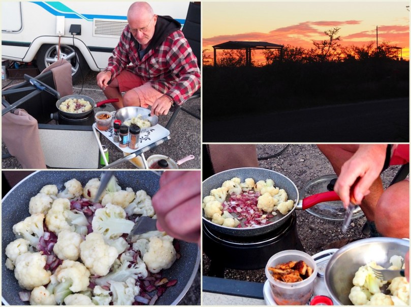 Wir bereiten uns, diesmal mit „temperaturgerechter“ Kleidung, auf unser Dinner vor und probieren zur täglichen Tagesschau, aus dem Internet gezogen, Blumenkohl mit Resthähnchenschnitzel, gebraten und frischem Salat.