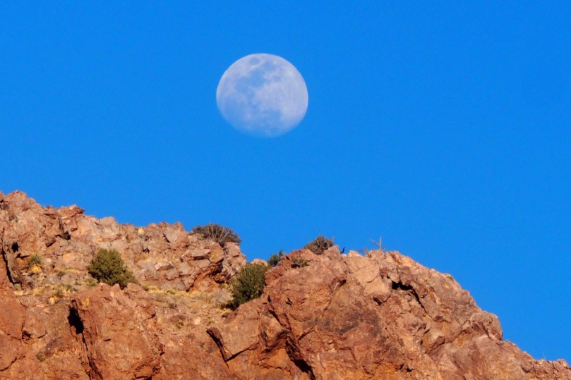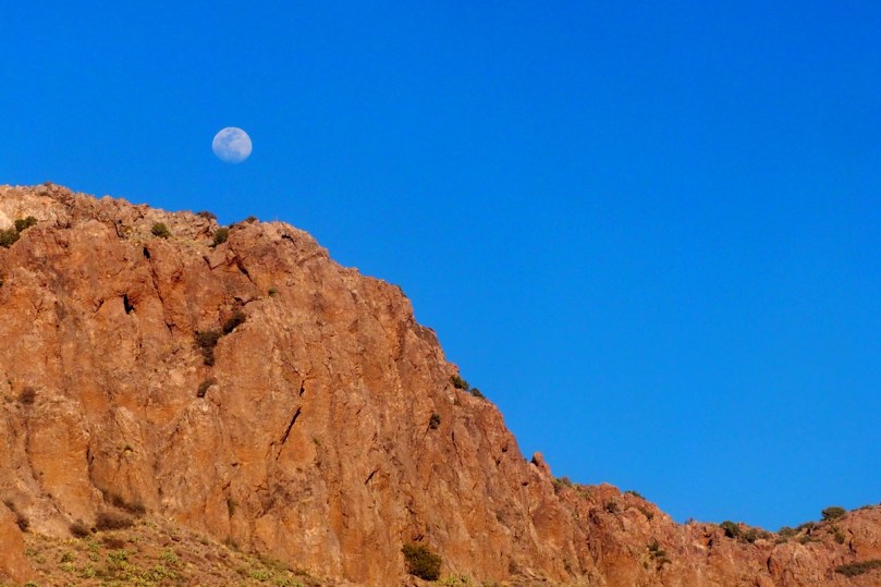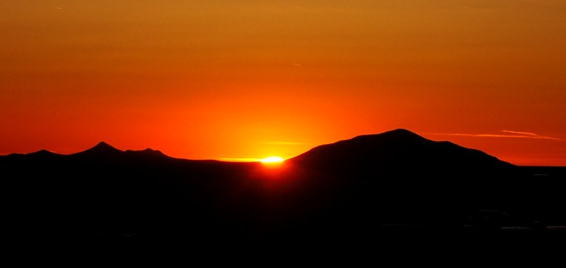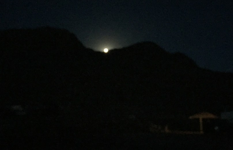 Zwischen den nächsten Fotos der westlich von uns untergehenden Sonne und des genau auf der anderen Seite, hinter den Bergen aufgehenden Mondes liegt…