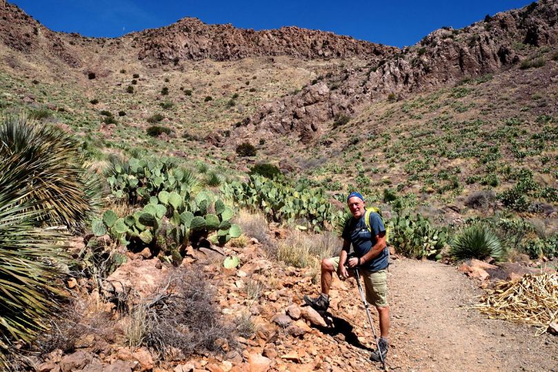 Wir widmen ihm noch das obige Abschiedsfoto, bevor wir nach den ersten unspektakulären 12 Kilometern rechts abbiegen und uns in den scharfen Verkehr des Hwy 62 Richtung Westen nach El Paso einfädeln.