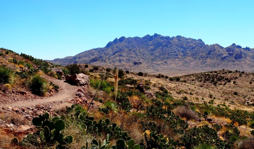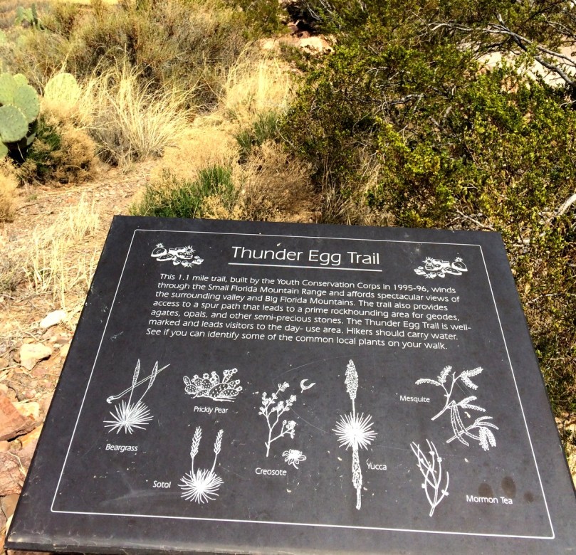 Die beiden Wanderwege in die Little Florida Mountains hinein, wir stehen auf ca. 1500 m Höhe und haben den freien Blick auf Florida Peak, die höchste Erhebung mit 2200 m dieses Gebirges, sind dadurch besonders, dass es ausdrücklich erlaubt ist, sich mit dem Hammer auf die Suche nach besonderen Steinen zu begeben. Wir sind nur bedingt erfolgreich… Die sind doch verdammt härter als gedacht und eigentlich brauchten wir einen „Steinschneider“, denn die besonders schönen kristallinen Strukturen liegen versteckt im Inneren der Brocken. Und zwar nach Auskunft derer, die sich damit auskennen, insbesondere in denen, die außen eine eiförmige Form zeigen. Sind nicht viele…