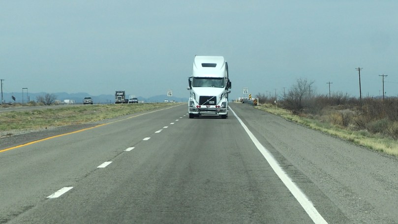 Auf ’nem Video könnte man jetzt erkennen, dass uns dieser Truck eben grade überholt hat: also, nicht nur der, der zu sehen ist, sondern auch der, der den, den man sehen kann, auf seine Hinterachse rückwärts drauf genommen hat.
