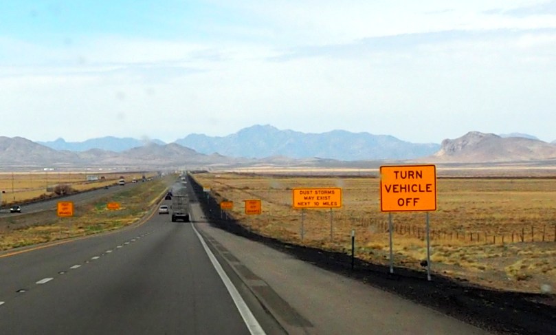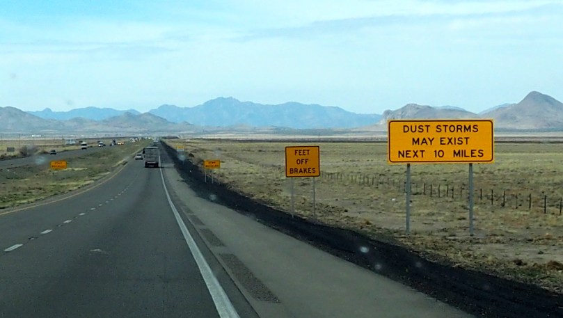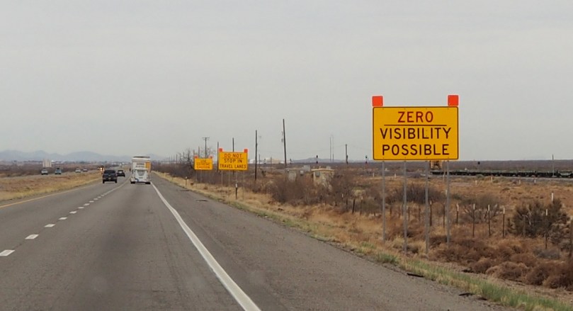 Es ist kein Aprilscherz, dass hier heftige Sandstürme über die Interstate 10 hinwegfegen können, aber die Erklärungen, die im Falle eines solchen darauf hinweisen, dass man nicht auf den Fahrstreifen anhalten, den Motor ausschalten und die Handbremse anziehen sollte, könnten durchaus als einer gelten: