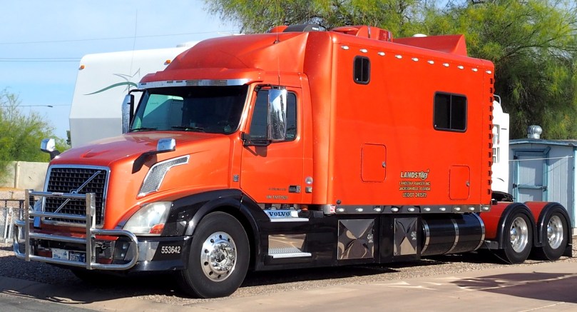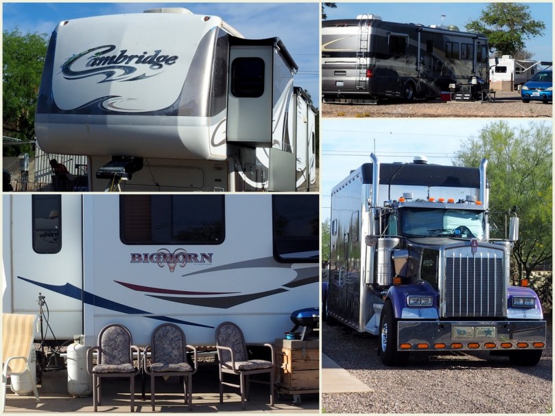 Wir bestaunen als erstes diese „Muskelprotz-Trucks“, sie sind nur die Zugfahrzeuge für 5th Wheeler, die die eigentliche Wohnung darstellen. Immer wieder Hingucker.
