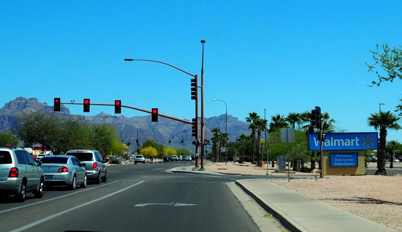 nur eine in die riesige Wüste hineingebaute scheinbar ohne Ende große Ansammlung von Kreuzungen, Ampeln, Hwys, Verkehrsschildern, den dazugehörigen Blocks, also Flächen zwischen den Straßen, darin zu findenden Einkaufszentren, RV-Resorts, Medical-Centers, Abschleppunternehmungen, diversen Autoverkaufsflächen, privaten Grundstücken oder besser Müllhalden und so viel ich weiß, mindestens einem Brillenfachgeschäft, in dem ich mir für $ 56 meine geliebte „Nickelbrille“, die nach einer Ultraschallreinigung kaputt gegangen ist, mittels Laserlötung wieder funktionsfähig machen lasse.
