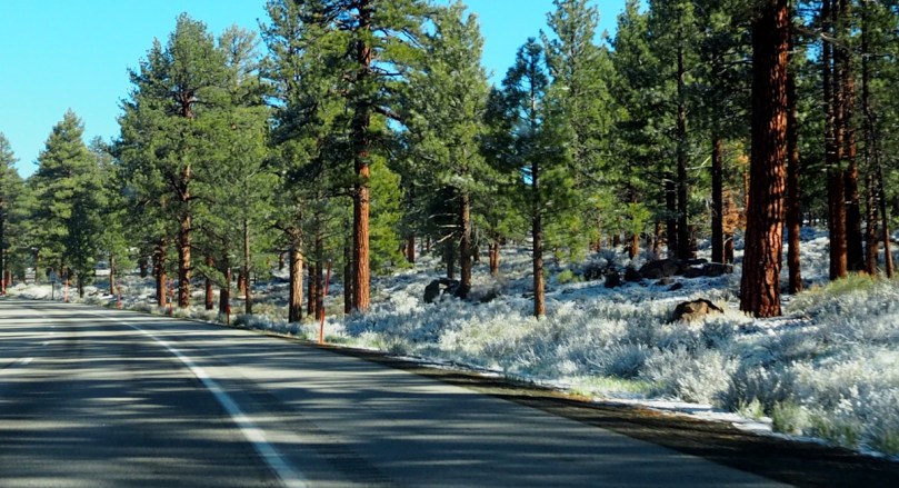 Die Sonne zeigt uns den Weg und die weißen Flächen links und rechts des Hwy scheinen eher Rauhreif als Schnee zu bedeuten. Es heißt trotzdem vorsichtig zu fahren, besonders auf den Brücken!