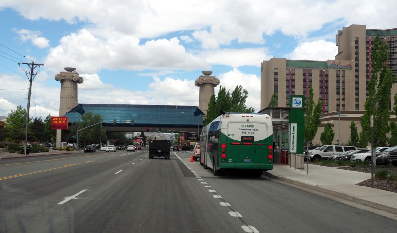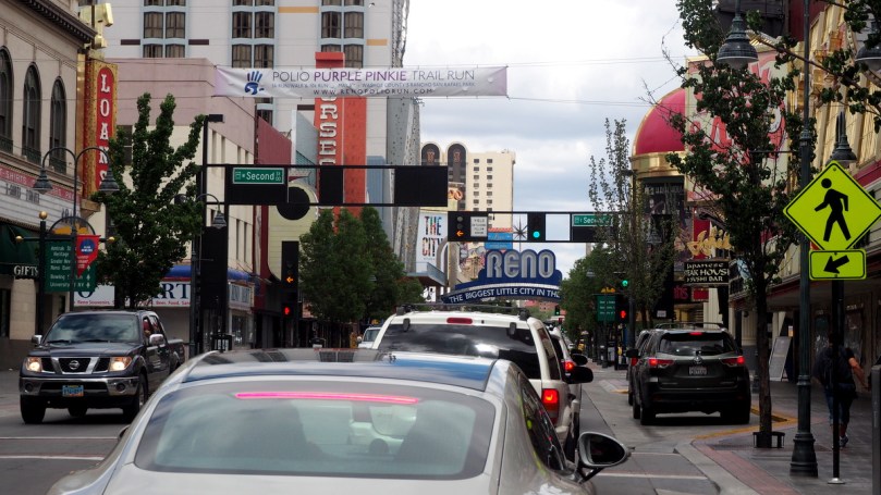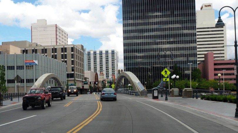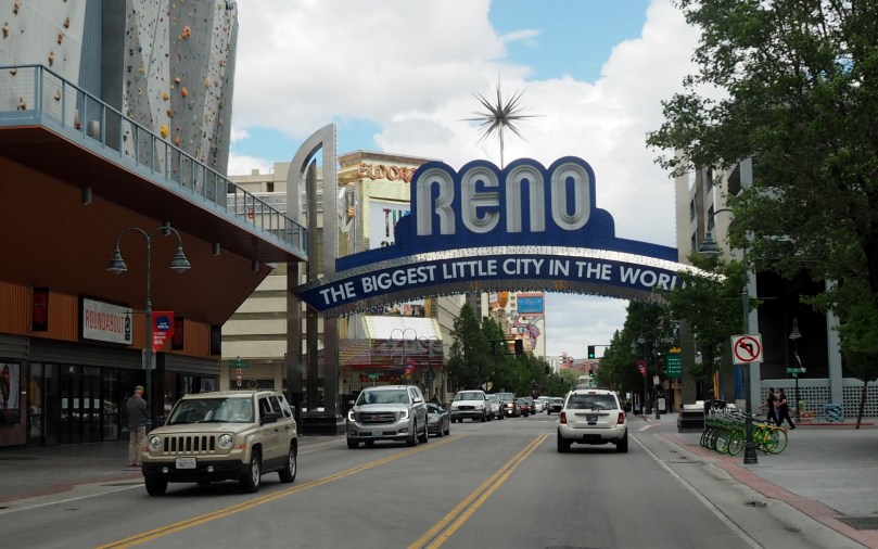 Wir werden von einem pompösen Stadttor begrüßt und stellen überrascht fest, dass der Hwy 395 mitten durch Downtown Reno führt. Das wird eine besondere fahrerische Herausforderung!