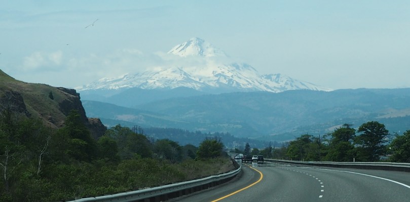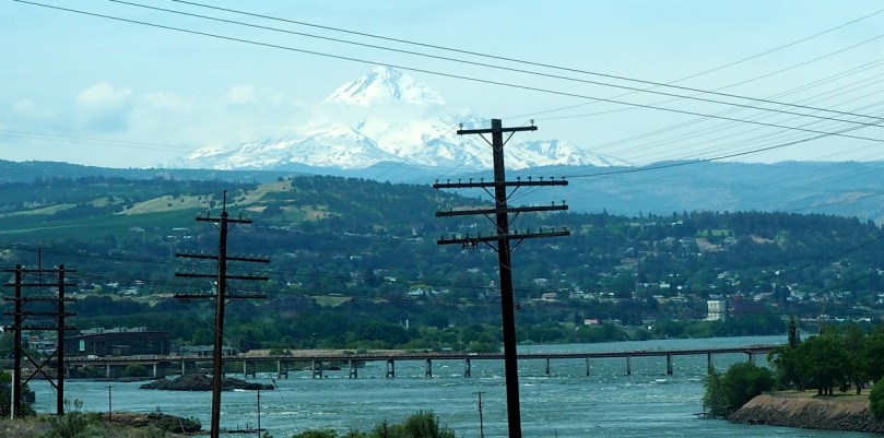 Diese letzten Bilder zeigen noch einmal, wie vielfältig die Blickwinkel auf unsere Umgebung immer wieder sind. Sie reichen von Gedanken an Deutschland über die herrliche Aussicht auf den mit mehr als 3400 Metern höchsten Berg Oregons, den Vulkan Mount Hood, eine der beeindruckenden Straßenbrücken von Oregon nach Washington, das riesige Wasserkraftwerk The Dalles Dam oder einfach nur wunderbare Frühlingsblumen auf dem Rastplatz an der Interstate.