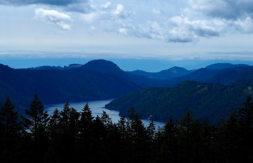 Diese changierenden Blautöne erstrecken sich über den Himmel, die bewaldeten Bergen und das Wasser des Pazific Ocean… nur die schwarzgrün gefärbten Baumkronen im Vordergrund müssen sich wohl unterscheiden.