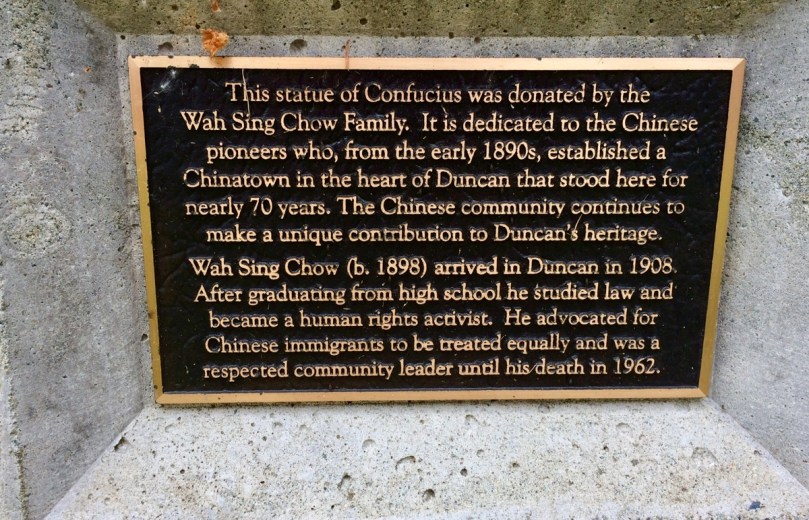 Konfuzius’s Statue, ein Geschenk der vormals in Duncan lebenden chinesischen Familien, zeigt uns ein weiteres bewahrendes Symbol für die Verbundenheit seiner aus der Ferne Asiens eingewanderter Menschen mit ihrem neuen Zuhause und gleichzeitig den respektvollen Umgang der nachfolgenden Generationen mit ihren Vor-Müttern und -Vätern.