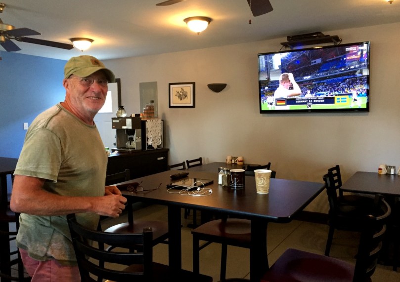 Es grenzt an ein Wunder: im Gemeinschaftsraum des Campingplatzes gibt es nicht nur eine Kaffeemaschine, die ich selbständig bedienen darf, sondern auch einen Flatscreen TV, halt mich fest, auf dem ich ein Spiel der Fußballweltmeisterschaft (Deutschland gegen Schweden) sehen kann…
