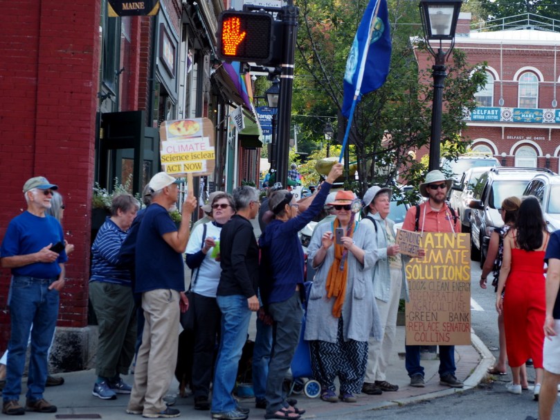 …und treffe an der großen Kreuzung dieses aufgeweckten Ortes an allen vier Ecken sehr aktive, singende und Sprechchöre einübende, friedvolle Menschen jeden Alters in gemeinsamer „Friday’s for Future“ Aktion. Es tut gut, gerade hier, in einem so kleinen Ort an der Ostküste der USA (dieser nach außen hin den Klimawandel so dreist ignorierenden Großmacht) zu spüren, dass es doch so viele gleichgesinnte Menschen gibt!
