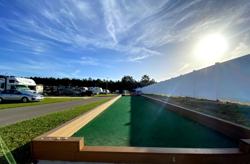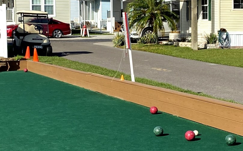 Bocce Ball, Konrad Adenauer lässt grüßen und vertreibe mir mit meinen ersten Erfahrungen auf dieser betonharten, mit Kunststoffnetzen bezogen Bahn jeden Gedanken an Probleme und deren Lösung etc.