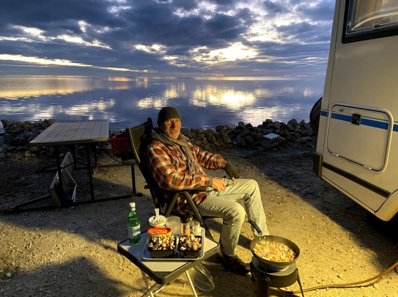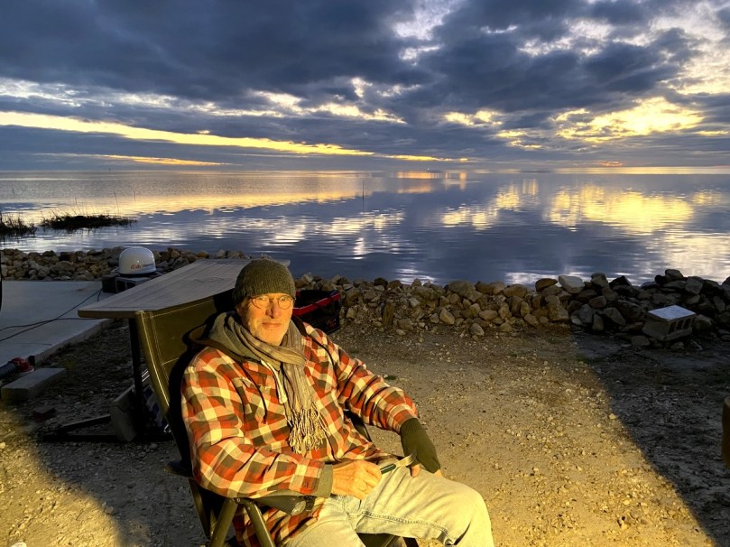 Es deutet sich an, dass es sich bei diesen Campern von überall aus den nördlichen Staaten der USA angereisten Rentnerpaaren um leidenschaftliche Angler und Fischer handelt, die kurz nach Sonnenaufgang mit ihren mehr oder wenig großen oder kleinen Booten aufs Wasser verschwinden und sich kurz vor Sonnenuntergang bei ihren Frauen wieder an den Tisch für’s vorgefertigte Dinner setzen.