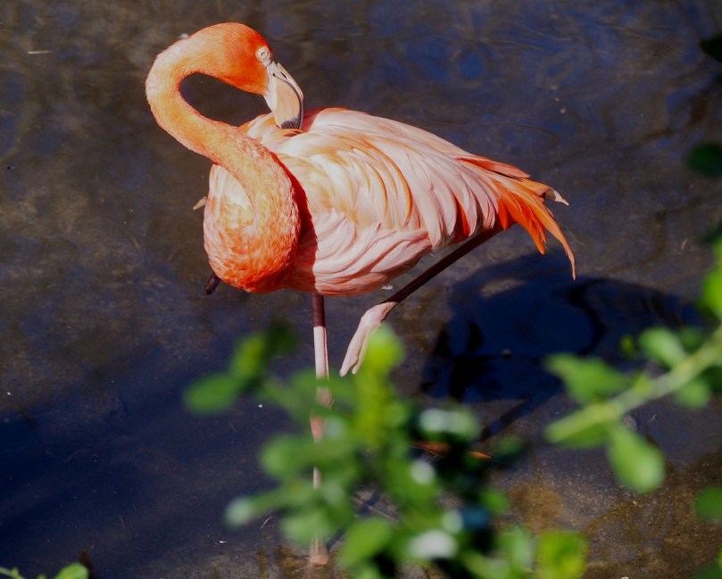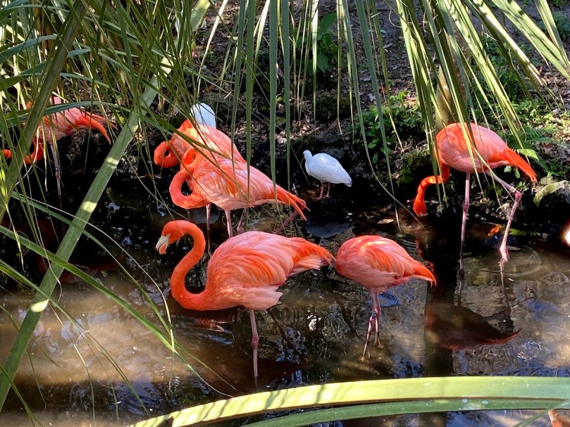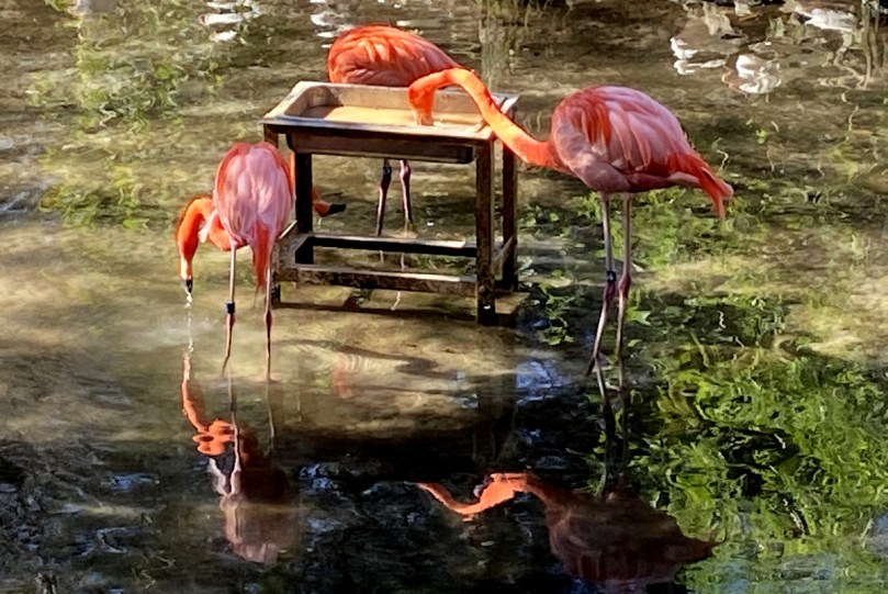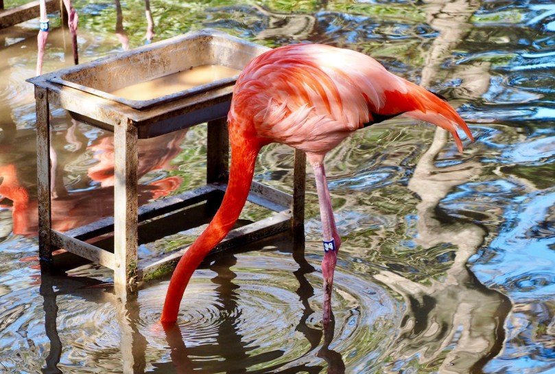 Diese wunderschönen Flamingos würden sich hier ohne von Menschenhand gefüllte Futtertröge bestimmt nicht aufhalten. Geschweige denn von uns in solch geringer Distanz gemütlich fotografieren lassen.