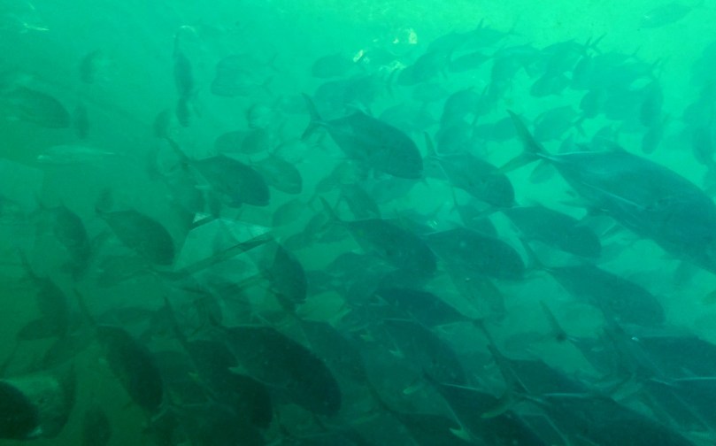 Sondern es gibt hier ein mehr oder weniger interessantes Seewasseraquarium, in dem die Fischschwärme kreisförmig, immer am Fenster vorbei, ihre Runden drehen. Wieso auch immer…