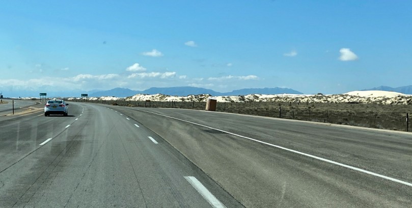 Auf der Fahrt dahin lassen wir, anders als unsere Reisekumpanen, das White Sands National Monument rechts liegen. Wir kennen dieses gleißende Weiß der „Gips“-Dünen vor dem strahlend blauen Himmel schon von unserer letzten Reise.