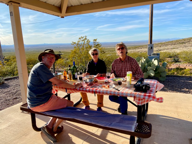 Wir schauen über unsere Weingläser entweder auf die herrlichen Berge oder in die unendliche Weite New Mexicos Richtung Westen. So lässt es sich gut erzählen.