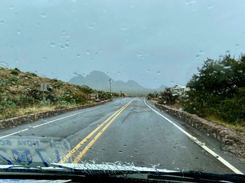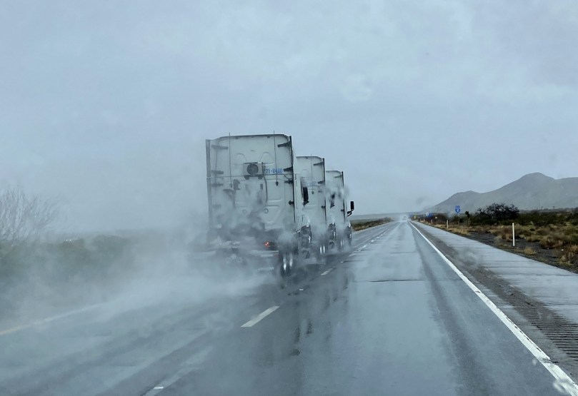 Auf derselben Strecke, auf der wir noch bei unserer letzten Reise vor heißen Sandstürmen gewarnt wurden, schaffen heute unsere Scheibenwischer die Menge des Regens kaum von der Scheibe. Andere haben es offensichtlich einfacher: Da nimmt einfach ein Truck zum Beispiel zwei andere „huckepack“ und sie ziehen im Kollektiv mit 120 km/h an uns vorbei. Ihre Gischt kommt für uns noch hinzu…