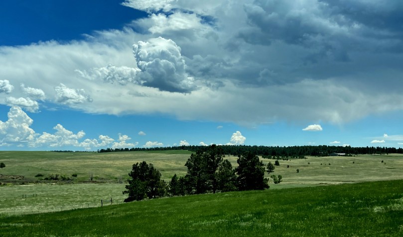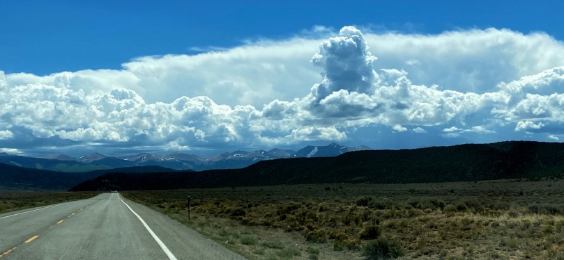 Wir genießen stundenlang einsame Highways in malerischer Landschaft und müssen nur einmal über einen nicht ganz so erschreckenden Pass. Gewaltige Wolkentürme tun sich über den Bergen, ich schätze mal bis auf 6000 m Höhe auf…