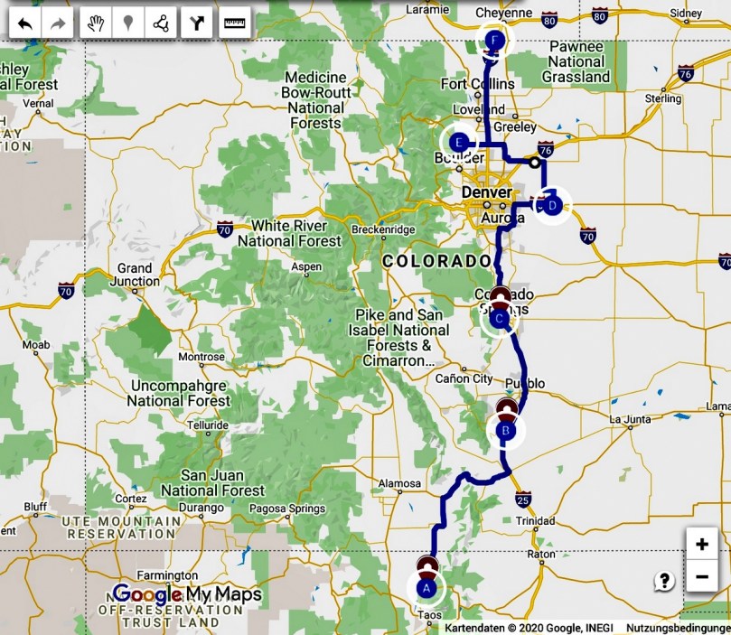 wir kommen zum zweiten Mal nach Colorado und schaffen die Strecke von Taos NM nach Colorado Springs und anschließend zur State Line nach Wyoming in drei Tagen.