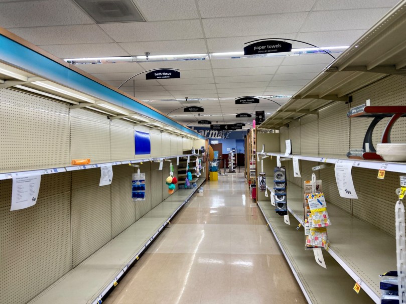 Weil Vero sich bereit erklärt, allein einzukaufen, rüstet sie sich mit Einmalhandschuhen und Gesichtsmaske aus. Ich selbst habe das Privileg und die Zeit, im Auto zu sitzen, zu lesen und zu warten.