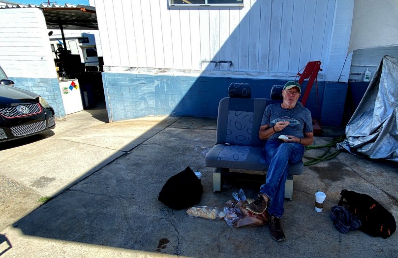 Weil die Kundenlounge bei Stuttgart Autohaus wg. der Pandemie nicht genutzt werden darf und Cafés und Restaurants natürlich auch geschlossen haben, gehen wir in den nächsten Supermarkt um die Ecke, kaufen uns Brot, Schinken und etwas zu trinken und machen es uns auf einer ausgebauten Rücksitzbank eines VW Transporters im schattigen Hof der Werkstatt gemütlich.