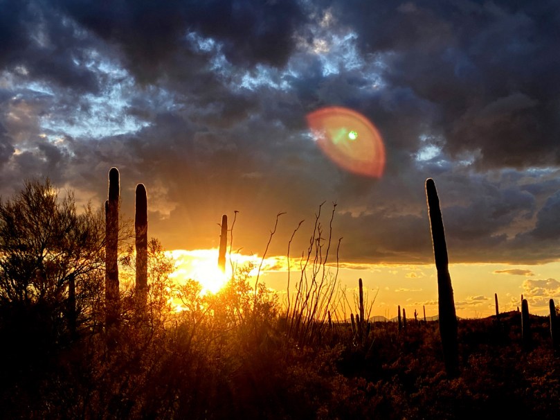 Die Sonne geht, wie immer in dieser Kakteenwüste, auf eine unbeschreiblich einmalig, ihre Umgebung färbende und die schlanken Saguaros kontrastierende Art, unter.