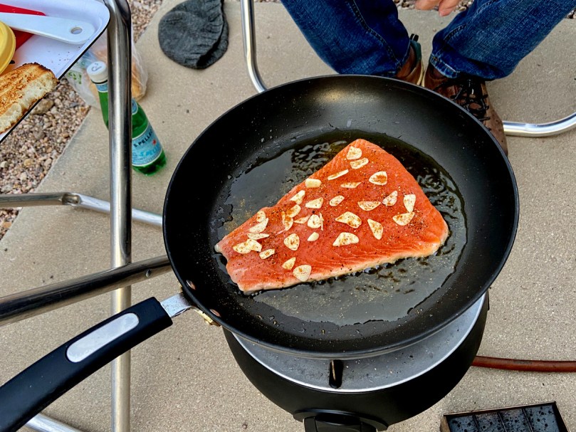 Mit Pfanne und/oder Topf gehe ich (auf Abstand) zu ihnen und Vero erzählt ihnen regelmäßig über unser tägliches Rezept (drinnen vorbereitet und draußen gekocht)