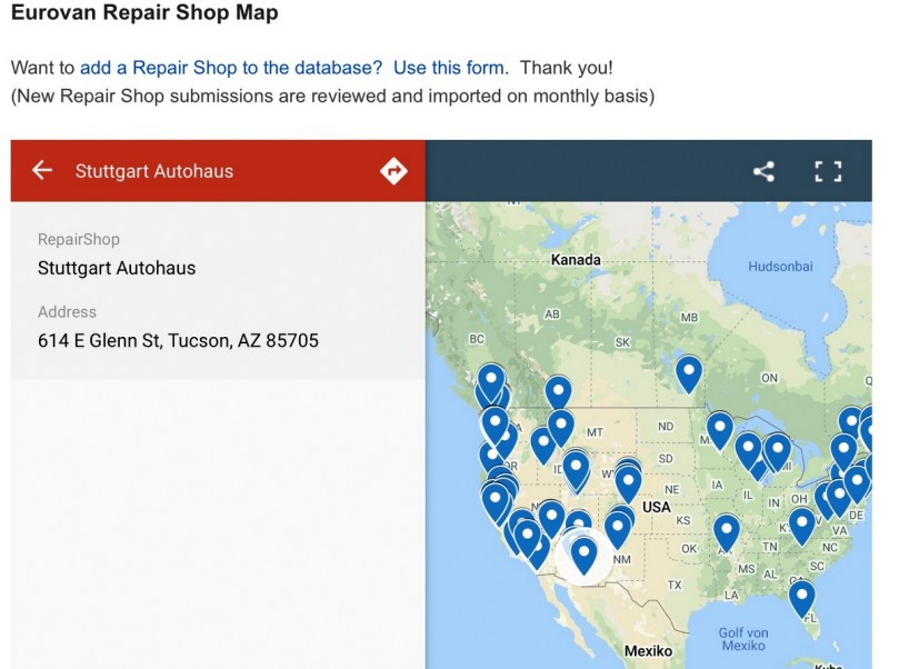 Im Übrigen hat es sich als sehr komfortabel herausgestellt, dass ich über die Facebook-Gruppe „Eurovan Owner“ auf der Eurovan Rescue Map sehr schnell herausfinden konnte, dass es in Tucson AZ diese Werkstatt speziell auch für VW T4 Transporter gibt…