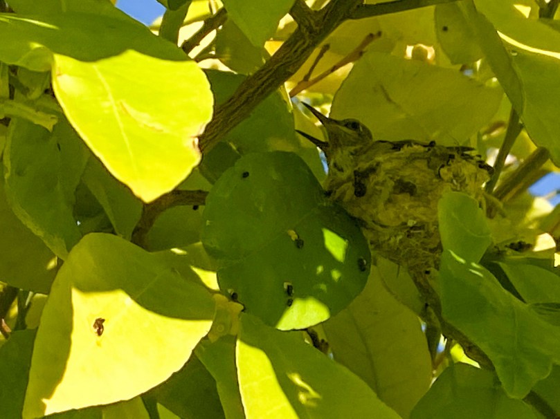 Junge Kolibris (mit dem schönen englischen Namen Hummingbirds) nisten für uns gleich um die Ecke und sind extra für das Foto schier erstarrt.